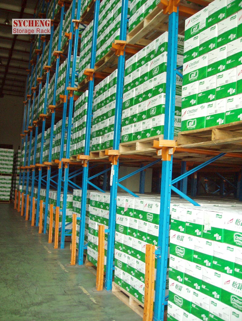 因為所有的貨物都是擺放在通廊式貨架的牛腿擱板上面的,托盤是按照深度方向來存放的,貨物存取從貨架同一側(cè)進出,貨物先存后取、后存先取,遵循“先進后出”的原則,叉車可方便的駛?cè)胴浖苤虚g存取貨物。由于整個叉車在貨架里面,只要是一個不留神就會容易碰撞到左右的貨物,因此叉車駕駛者必須要格外的小心。