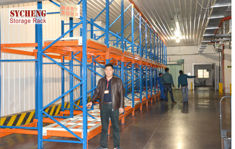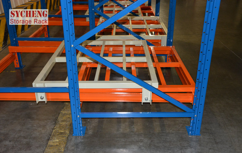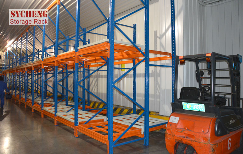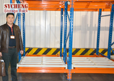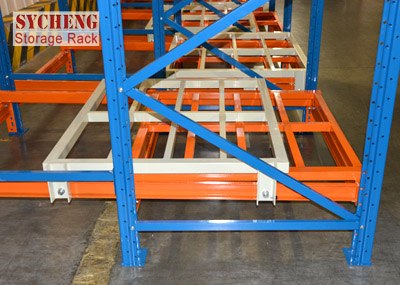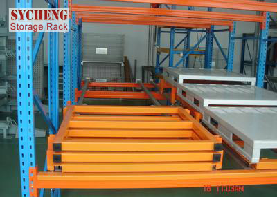 是使保管效率增加而設(shè)計的形式,其原理是在前后梁間以多層臺車重疊相撞,在貨架前端將貨物置于臺車上,后儲存貨物時叉車同時會將原先貨物推向里面。臺車通過軸承跨于傾斜軌道上,當(dāng)外側(cè)貨物被取走時,里面的臺車會自動滑向外側(cè)??梢砸?guī)劃儲位深度位2-4個棧板,最深可達5個棧板。