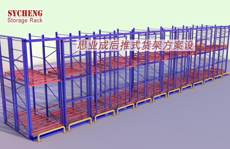 又名壓入式貨架——是在前后梁間以多層臺車重疊相接,從外側(cè)將疊棧貨物置于臺車推入,后儲存之貨品會將原先貨品推往里面。